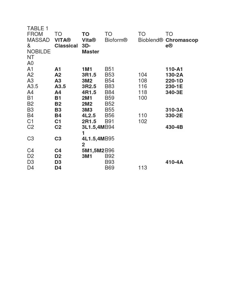 Massad® and nobildent ™ denture teeth shade conversion table.. Hi, a new account sent me a shade from the vita toothguide 3d master, shade 4l 1.5. Can anyone convert this into a denture vita or bioform shade please? 26/05/2010 · anything to add or change let me know. May 14, 2013 #44 ; Equivalencia vita 3d master in management; Modern design as an expression of perfect esthetics and a clear structure ; Reliable, fast and precise shade determination for satisfied customers; B1 a1 c1 a2, b2, b3 a3.. Equivalencia vita 3d master in management;